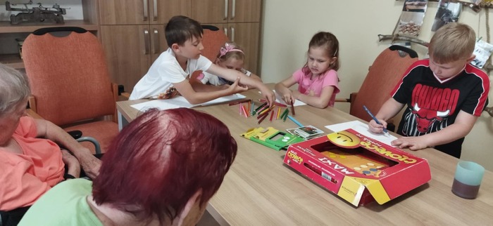 Po hrách se děti pustily do malování. Jejich obrázky byly plné barev a fantazie. Některé děti se rozhodly věnovat své výtvory seniorům jako malou vzpomínku na společně prožité chvíle.
