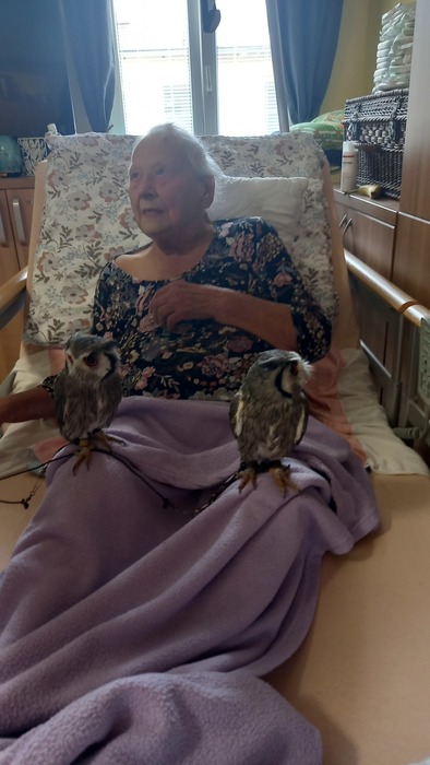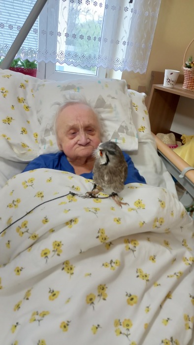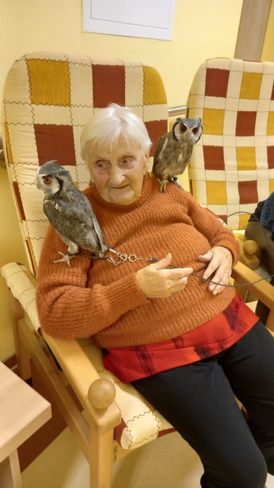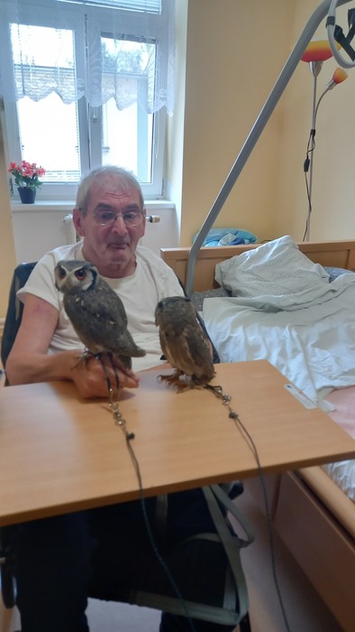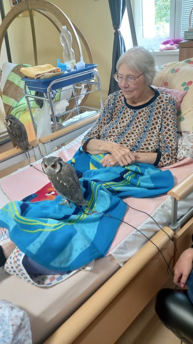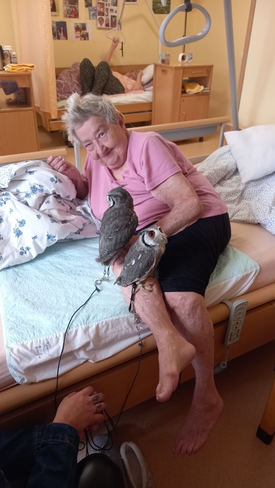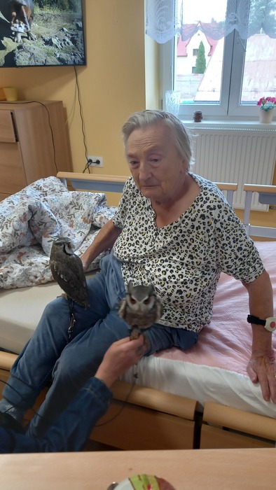 Ve čtvrtek 26.9.2024 k nám do domova zavítali na Falconyterapii dva Výrečci bělolící. Jednalo se tak o příjemné zpestření odpoledne v po povodňové době. Sovičky navštívily klienty na pokojích, paní chovatelka zodpovídala dotazy klientů k péči o sovičky, zatímco klienti měli výrečky na rukou, ramenou či na dece a mohli je hladit a povídat si s nimi. Návštěva soviček měla mezi klienty velký ohlas. Za návštěvu děkujeme paní Tělecké a těšíme se na další setkání.