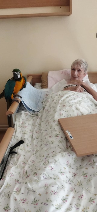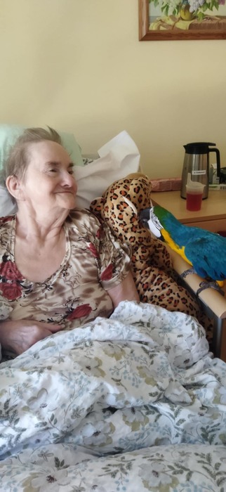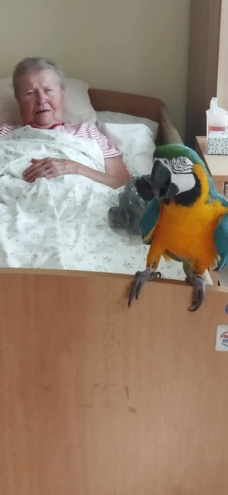 Papoušek Kačenka je krásně zbarvená a velmi společenská Ara, která si rychle získala pozornost všech obyvatel. Její přítomnost vnáší do pokoje veselou atmosféru. Někteří klienti měli Kačenku na rukou jiní zase na lůžku, Kačenka mluví, takže bylo slyšet tu tam i nějaké slovíčko.